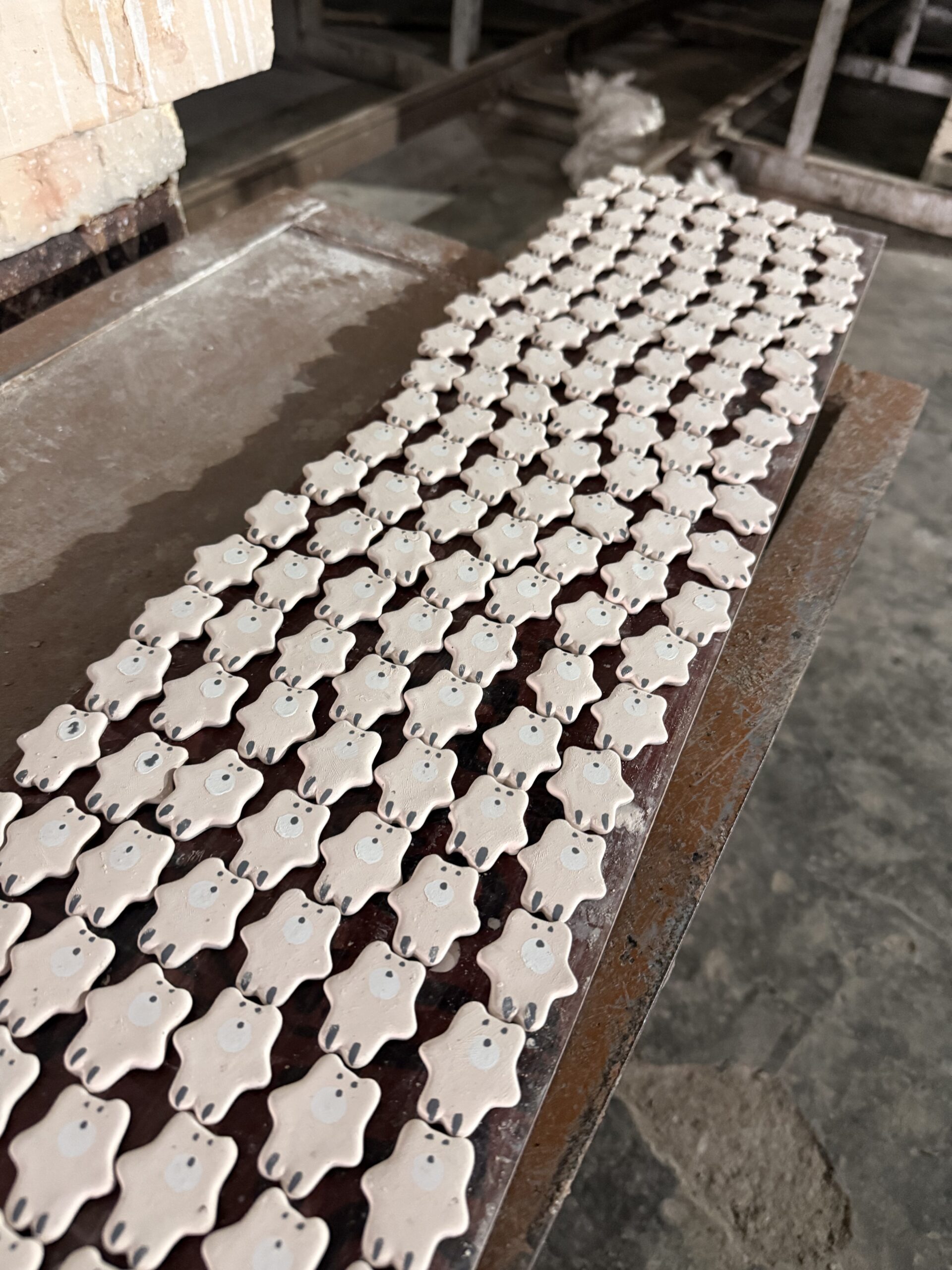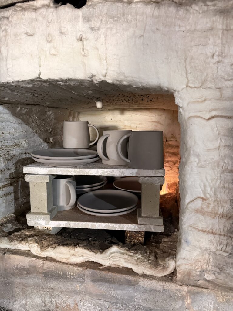 - Bisque Firing: This first firing removes moisture and hardens the clay. The matte finish you see on the mugs and plates in the image suggests they’re in this stage — preparing to receive their glaze